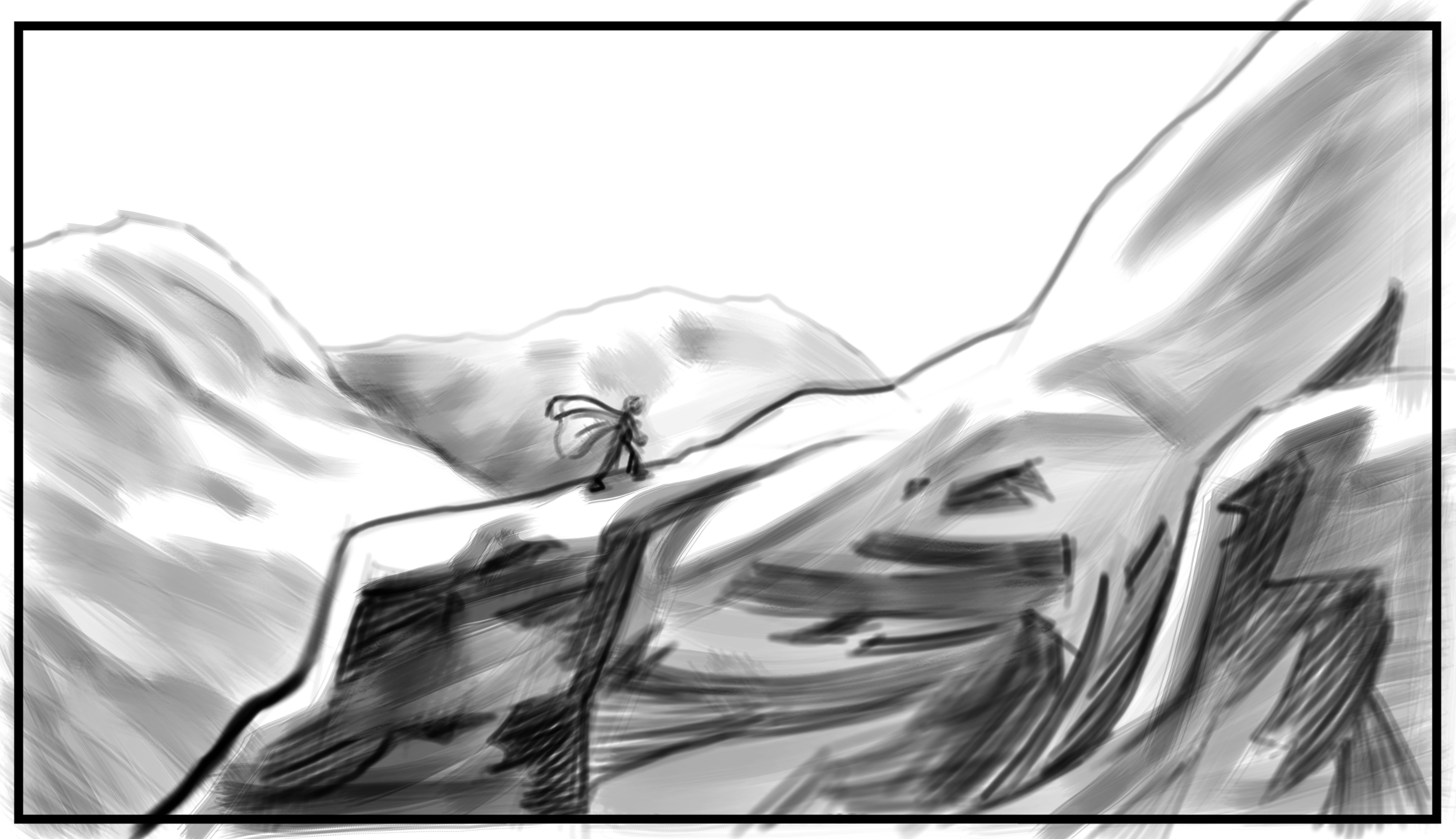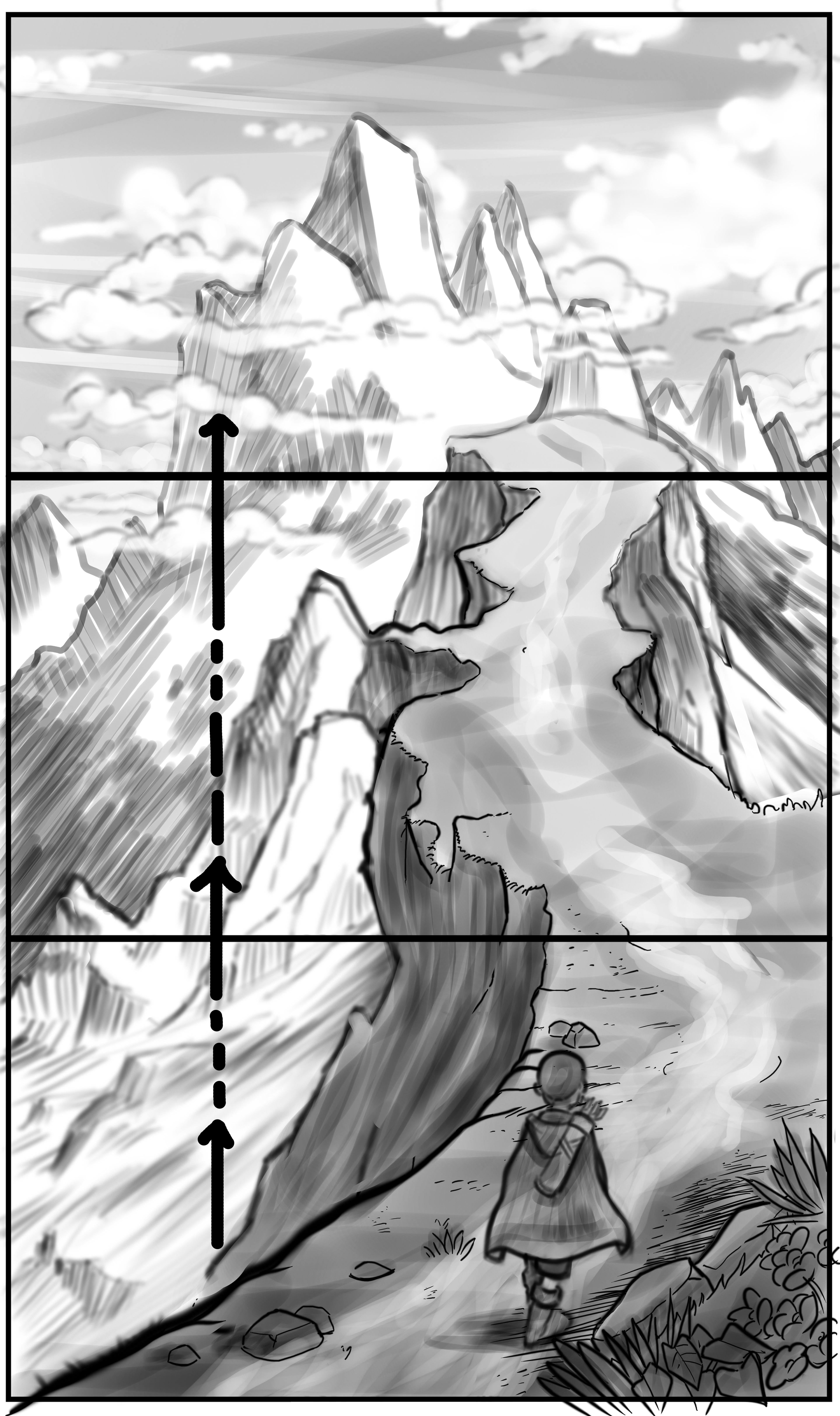 ci-contre: Travelling vertical, du bas vers le haut, où la caméra suit le personnage qui évolue sur un chemin dans les montagnes.